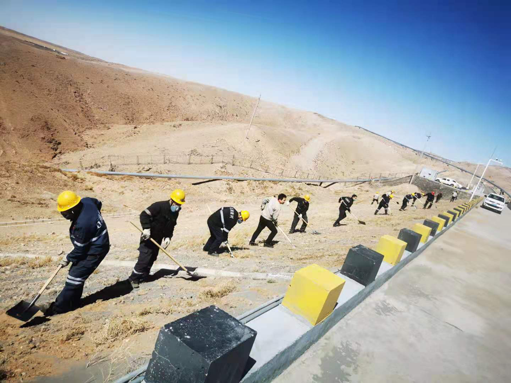 本次活動(dòng)重點(diǎn)對(duì)基礎(chǔ)壩兩側(cè)坡面進(jìn)行綜合治理,治理長(zhǎng)度約1.5公里。面對(duì)坡陡、風(fēng)大、黃沙亂舞的工作環(huán)境,黨員干部不懼困難、以身作則、俯沖一線,帶頭撿拾垃圾、清理尾砂、覆土灑水以及對(duì)安全警示牌進(jìn)行維護(hù)保養(yǎng)。廣大職工緊跟其后,或一字排開,或矩陣展開,忙碌的身影遍布整個(gè)坡面,鏟車的轟鳴聲、鐵锨的吱吱聲與狂風(fēng)的呼嘯聲琴簫合奏,在藍(lán)天、斜陽(yáng)和荒山的襯托下,勾勒出一幅“聲與色”、“動(dòng)與靜”相得益彰的勞動(dòng)生產(chǎn)畫卷。